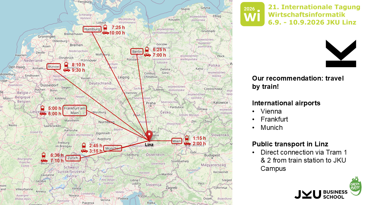 Für die Anreise nach Linz empfehlen wir die Bahn. Für internationale Teilnehmer:innen gibt es eine Direktverbindung von Wien-Flughafen nach Linz (z.B. bei Flügen mit Austrian Airlines mit Ziel Linz inkludiert). Innerhalb von Linz können von den Teilnehmer:innen der Tagung die öffentlichen Verkehrsmittel für die gesamte Tagungsdauer genutzt werden. An der Universität stehen kostenpflichtige Parkplätze zur Verfügung.